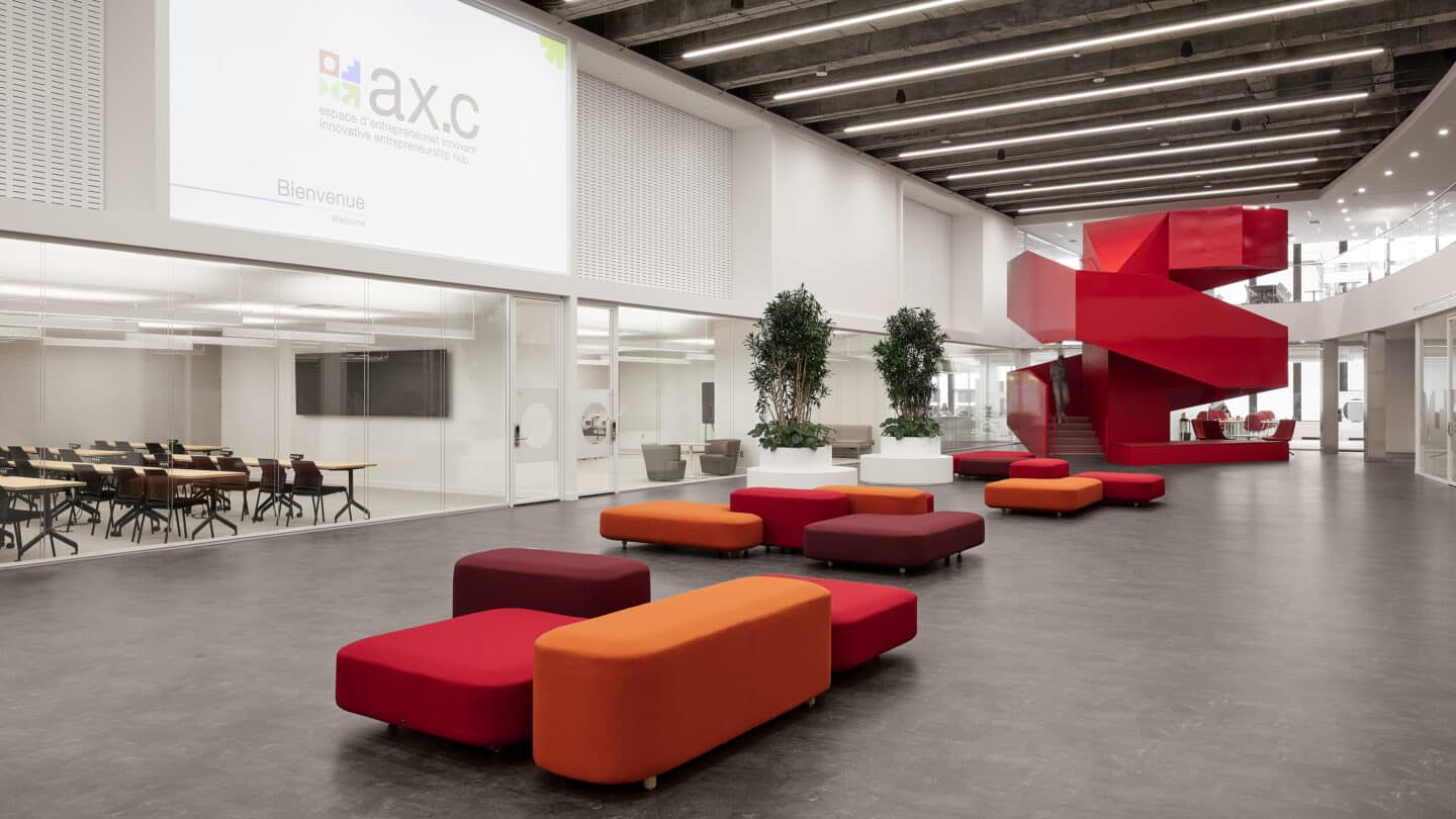 Situé aux troisième et quatrième étages de la Place Victoria, Ax.c offre 100 000 pi² d’espaces de travail, d’idéation, de rencontres modernes et variés, et un espace de travail pour prototypage disponible pour les startups.