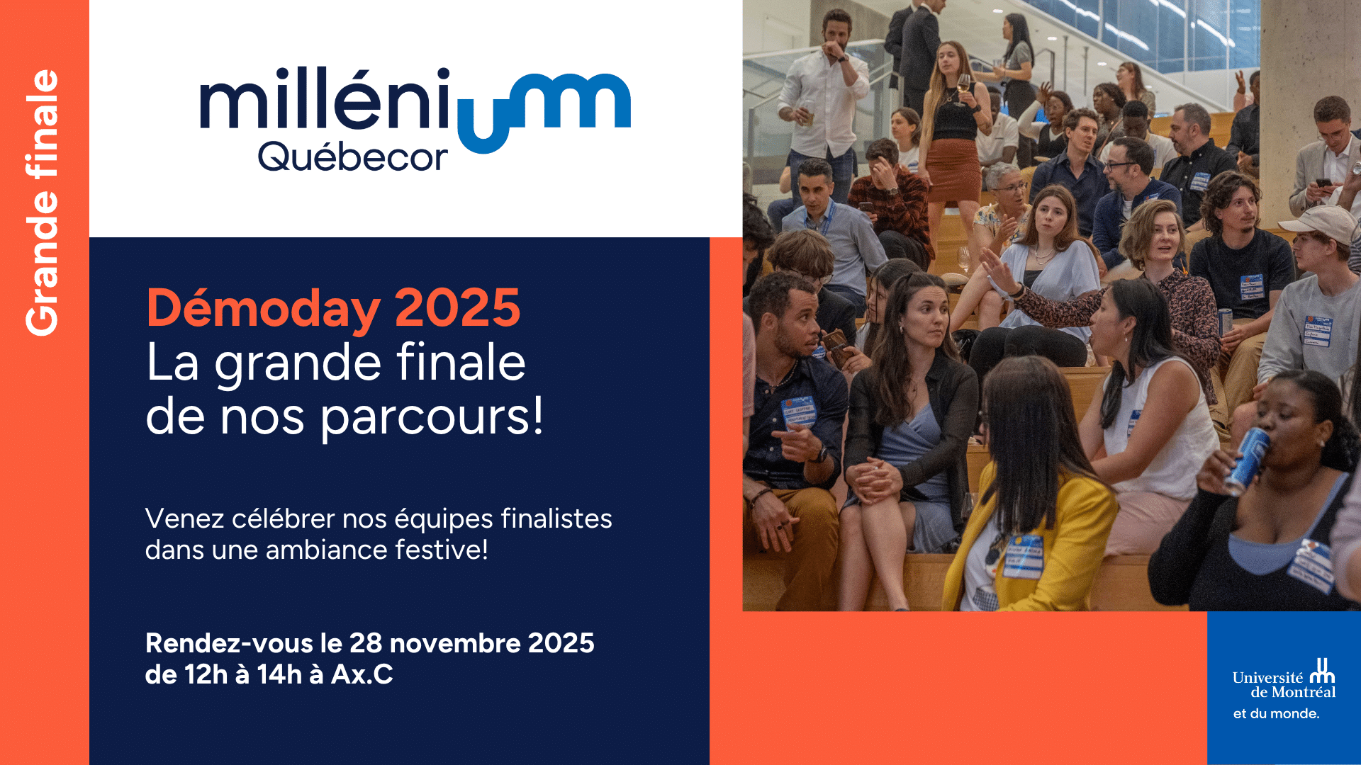 Le DÉMODAY Millénium Québecor est le rendez-vous de fin de parcours qui met à l’honneur les entrepreneur(e)s des programmes Datapreneur, Innovinc, Recherche ton Impact et PERCER. Nous allons profiter de cette occasion pour mettre en lumières les finalistes de l'Université de Montréal en lien avec les Bourses Pierre-Péladeau 2025.