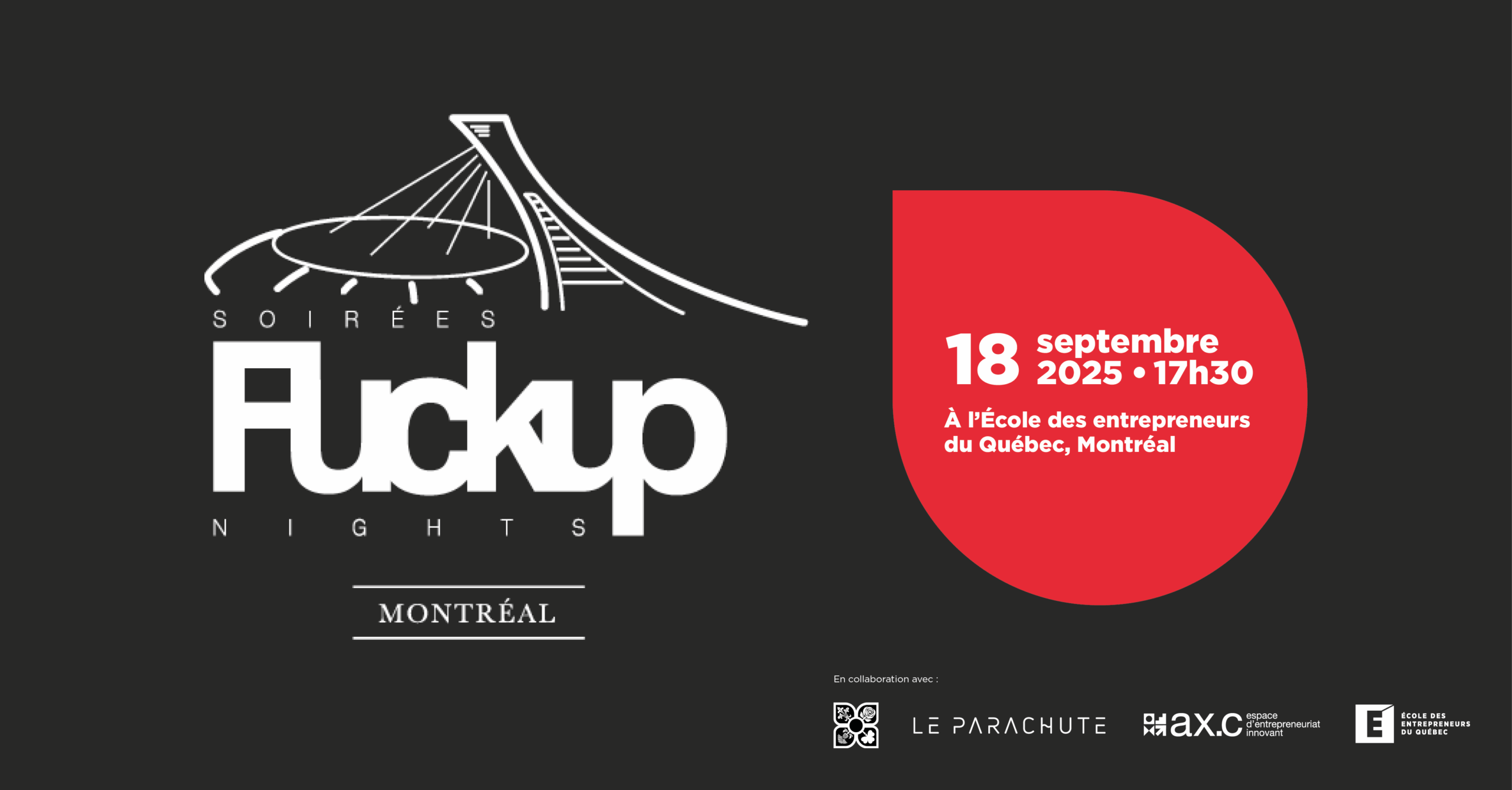 Pour cette édition, l'EEQ et Fuckup Nights Montréal collaborent avec Le Parachute, qui offre des ressources en bien-être et en santé mentale aux professionnels.lles et aux entrepreneurs.eures.